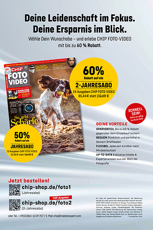 Du hast ein gesetzliches Widerrufsrecht, die Belehrung kannst Du unter www. chip-shop. de / widerrufsrecht abrufen. CHIP FOTO-VIDEO erscheint im Verlag: Five Monkeys Media GmbH, Bremer Straße 27, 15234 Frankfurt( Oder). Geschäftsführung: Andreas Laube. Handelsregister: AG Frankfurt( Oder); HRB 20675; Die Betreuung der Abonnenten erfolgt durch: MEXO Medien Expert Online GmbH, Am Bahnhof 3, 19086 Plate. Der Verlag behält sich vor, Bestellungen ohne Angabe von Gründen abzulehnen. * Ortsüblicher Tarif