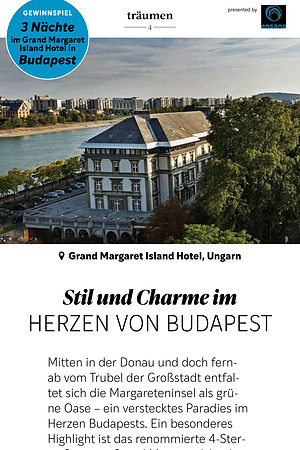 Lust auf eine Auszeit? Wir verlosen drei Nächte für zwei Personen im Deluxe Plus Doppelzimmer im Grand Margaret Island Hotel in Budapest inklusive Halbpension, eine Deluxe-Massage pro Person sowie Nutzung des Spa-Bereichs und Fitnessraums. Lass dir diese Chance nicht entgehen! Einfach hier die Leserumfrage ausfüllen! Teilnahmeschluss ist am 22. Juni 2025.