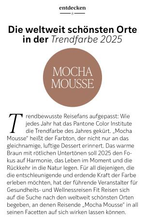 T rendbewusste Reisefans aufgepasst: Wie jedes Jahr hat das Pantone Color Institute die Trendfarbe des Jahres gekürt. „ Mocha Mousse“ heißt der Farbton, der nicht nur an das gleichnamige, luftige Dessert erinnert. Das warme Braun mit rötlichen Untertönen soll 2025 den Fokus auf Harmonie, das Leben im Moment und die Rückkehr in die Natur legen. Für all diejenigen, die die entschleunigende und erdende Kraft der Farbe erleben möchten, hat der führende Veranstalter für Gesundheits- und Wellnessreisen Fit Reisen sich auf die Suche nach den weltweit schönsten Orten begeben, an denen Reisende „ Mocha Mousse“ in all seinen Facetten auf sich wirken lassen können.
