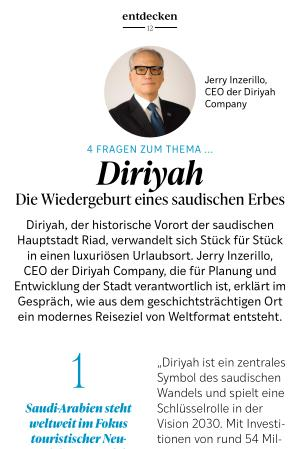 „ Wir stehen noch am Anfang unserer Entwicklung, doch schon jetzt hat Diriyah viel zu bieten. Wir freuen uns darauf, immer mehr Gäste – auch aus Deutschland – willkommen zu heißen, damit sie die Schönheit unserer Stadt erleben können. Deutsche Reisende, wie Besucher aus über 60 weiteren Ländern, können ihr saudisches Touristenvisum bequem online beantragen. Im Dezember eröffneten wir unser erstes Hotel, das Bab Samhan – ein Luxury Collection Hotel mit 134 Zimmern im traditionellen Najdi-Stil. Bald folgen renommierte Marken wie Ritz- Carlton, Four Seasons, Raffles, Orient Express, Aman und Capella.
