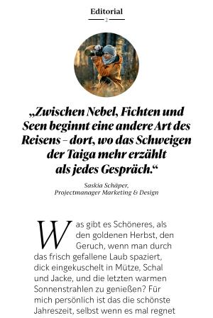 „ Zwischen Nebel, Fichten und Seen beginnt eine andere Art des Reisens – dort, wo das Schweigen der Taiga mehr erzählt als jedes Gespräch.“