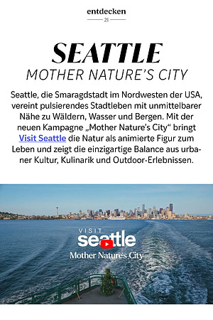 Seattle, die Smaragdstadt im Nordwesten der USA, vereint pulsierendes Stadtleben mit unmittelbarer Nähe zu Wäldern, Wasser und Bergen. Mit der neuen Kampagne „ Mother Nature’ s City“ bringt Visit Seattle die Natur als animierte Figur zum Leben und zeigt die einzigartige Balance aus urbaner Kultur, Kulinarik und Outdoor-Erlebnissen.