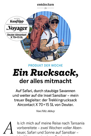 A ls ich mich auf meine Reise nach Tansania vorbereitete – zwei Wochen voller Abenteuer, Safari und Sonne auf Sansibar – wusste ich: Alles muss in einen Rucksack passen. Keine Ausweichmöglichkeiten, keine Extratasche. Mein treuer Begleiter: der Deuter Aircontact X 70 + 15 SL, speziell für Frauen entwickelt und gebaut für große Reisen. Ich habe ihn vollgepackt, getestet, getragen – und lieben gelernt.