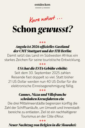 +++ Angola ist 2026 offizielles Gastland der CMT Stuttgart und der ITB Berlin: Damit setzt das Land im Südwesten Afrikas ein starkes Zeichen für seine touristische Entwicklung. +++ USA hat die ESTA-Gebühr erhöht: Seit dem 30. September 2025 zahlen Reisende fast doppelt so viel. Statt bisher 21 US-Dollar werden nun 40 US-Dollar für die elektronische Einreisegenehmigung fällig. +++ Cannes, Nizza und Villefranche schränken Kreuzfahrten ein: Die drei Mittelmeerstädte begrenzen künftig die Zahl der Schiffsanläufe, um Umwelt und Innenstadtbereiche zu entlasten. Ziel ist ein nachhaltigerer Tourismus an der Côte d’ Azur. +++ Neuer Nachtzug von Belgien in die Slowakei: Ab Dezember 2026 startet Leo Express eine Verbindung vom belgischem Seebad Ostende bis nach Bratislava – mit Stopps in Köln, Hannover und Dresden. +++ Neue Handgepäck-Regeln an EU-Flughäfen: An Flughäfen mit modernen CT-Scannern dürfen Passagiere jetzt Flüssigkeiten bis zu zwei Litern mitführen. Wo noch alte Technik im Einsatz ist, bleibt die 100-ml-Grenze bestehen – Reisende sollten sich vorab informieren. +++ Ryanair schafft Papier-Bordkarten ab: Ab 12. November 2025 sind nur noch digitale Bordkarten über die myRyanair-App gültig. Ausdrucke werden nicht mehr akzeptiert. +++ Italien verschärft Bußgelder für illegale Müllentsorgung: Wer Abfall aus dem Auto wirft, zahlt bis zu 18.000 Euro – selbst kleine Verstöße wie Zigarettenkippen oder Taschentücher kosten 1.188 Euro. Die Regel gilt auch für Touristen. +++ Irlands erstes Whiskey-Hotel hat im Juli 2025 im historischen Küstenort Carnlough an der spektakulären Causeway Coast eröffnet. Das „ The Harbourview Hotel” verbindet edle Tropfen mit stilvoller Gastlichkeit. +++ Neues Ein- und Ausreisesystem in Düsseldorf: Seit dem 12. Oktober erfasst das EU-Entry-Exit-System( EES) Fingerabdrücke und Gesichtsbilder von Nicht-EU-Reisenden. Düsseldorf ist erster deutscher Flughafen mit dem neuen System, Frankfurt und München folgen bald. +++ Strengere Alkohol-Regeln in Thailand: Ab 8. November 2025 gilt ein erweitertes Alkoholverbot zwischen 0 – 11 Uhr und 14 – 17 Uhr. Wer dagegen verstößt, zahlt bis zu 10.000 Baht( ca. 270 €) – auch Touristen sind betroffen.