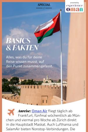 Frankfurt, fünfmal wöchentlich ab München und viermal pro Woche ab Zürich direkt in die Hauptstadt Maskat. Auch Lufthansa und SalamAir bieten Nonstop-Verbindungen. Die Flugzeit ab Deutschland beträgt 6 bis 7 Stunden. Alternativ sind Umsteigeverbindungen über Abu Dhabi( z. B. mit Etihad) möglich. Wer nach Salalah möchte, reist über Maskat weiter – der Inlandsflug dauert etwa 90 Minuten.