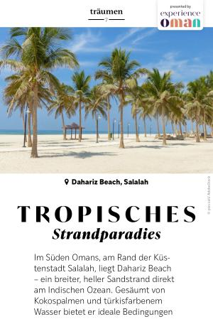 Im Süden Omans, am Rand der Küstenstadt Salalah, liegt Dahariz Beach – ein breiter, heller Sandstrand direkt am Indischen Ozean. Gesäumt von Kokospalmen und türkisfarbenem Wasser bietet er ideale Bedingungen für einen entspannten Badeurlaub. Das Meer ist ruhig, der Sand weich, die Atmosphäre gelassen. In unmittelbarer Nähe befinden sich mehrere Hotels und Resorts, von kleinen Unterkünften bis zu komfortablen Strandhotels – perfekt für Reisende, die Sonne, Meer und Erholung suchen. Dahariz Beach verbindet tropisches Flair mit omanischer Gastfreundschaft – ein idealer Ort, um im Süden des Landes zur Ruhe zu kommen.