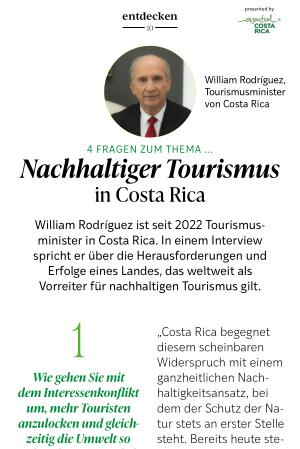 „ Costa Rica begegnet diesem scheinbaren Widerspruch mit einem ganzheitlichen Nachhaltigkeitsansatz, bei dem der Schutz der Natur stets an erster Stelle steht. Bereits heute stehen rund 26 % unserer Landfläche unter Naturschutz. Diesen Anteil möchten wir in Zukunft durch zusätzliche Maßnahmen wie den ‚ Pura Vida Pledge‘ weiter erhöhen. Unser Ziel ist, dass sich der Mensch an die Natur anpasst und nicht umgekehrt. Mit unserem Zertifikat für nachhaltigen Tourismus( CST) setzen wir international anerkannte Standards. Außerdem investieren wir viel in Bildungs- und Sensibilisierungsmaßnahmen, damit sowohl Anbieter als auch Reisende nachhaltige Entscheidungen treffen.“