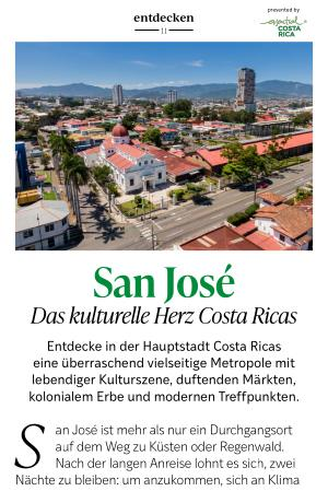 wer sich auf sie einlässt, entdeckt eine lebendige, kontrastreiche Stadt: historische Viertel wie Barrio Amón und Barrio Escalante mit pastellfarbenen Holzhäusern der alten Kaffeebarone, daneben hippe Cafés, Galerien, Craft-Bars und Streetfood- Märkte. Rund um die Avenida Central mischen sich tropische Gelassenheit und urbanes Treiben. Die wichtigsten Orte lassen sich gut zu Fuß oder per Free Walking Tour erkunden.