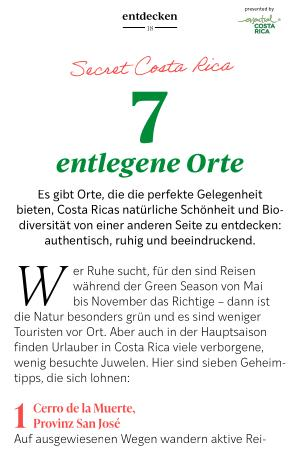 W er Ruhe sucht, für den sind Reisen während der Green Season von Mai bis November das Richtige – dann ist die Natur besonders grün und es sind weniger Touristen vor Ort. Aber auch in der Hauptsaison finden Urlauber in Costa Rica viele verborgene, wenig besuchte Juwelen. Hier sind sieben Geheimtipps, die sich lohnen: