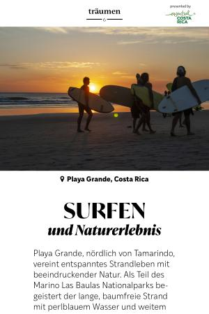 Playa Grande, nördlich von Tamarindo, vereint entspanntes Strandleben mit beeindruckender Natur. Als Teil des Marino Las Baulas Nationalparks begeistert der lange, baumfreie Strand mit perlblauem Wasser und weitem Blick bis zum Horizont. Kleine Restaurants, ein Surfshop und ein Supermarkt sorgen für charmante Einfachheit. Die abwechslungsreichen Wellen machen Playa Grande zum idealen Surfspot für alle Könnensstufen – ruhig bei Ebbe, fordernd bei Flut. Wer Naturverbundenheit und Surferlebnis sucht, findet hier den perfekten Ort.