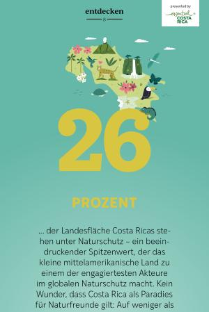 ... der Landesfläche Costa Ricas stehen unter Naturschutz – ein beeindruckender Spitzenwert, der das kleine mittelamerikanische Land zu einem der engagiertesten Akteure im globalen Naturschutz macht. Kein Wunder, dass Costa Rica als Paradies für Naturfreunde gilt: Auf weniger als 0,03 % der Erdoberfläche beheimatet es rund 6,5 % der weltweiten Artenvielfalt. Über 500.000 verschiedene Tier- und Pflanzenarten wurden hier registriert – von gemächlich baumelnden Faultieren über energiegeladene Totenkopfäffchen bis zu leuchtend bunten Fröschen, Tukane oder riesigen Schmetterlingen.