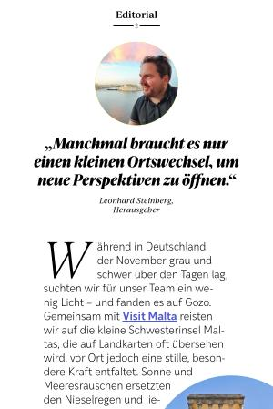 W ährend in Deutschland der November grau und schwer über den Tagen lag, suchten wir für unser Team ein wenig Licht – und fanden es auf Gozo. Gemeinsam mit Visit Malta reisten wir auf die kleine Schwesterinsel Maltas, die auf Landkarten oft übersehen wird, vor Ort jedoch eine stille, besondere Kraft entfaltet. Sonne und Meeresrauschen ersetzten den Nieselregen und ließen uns schneller als gedacht aufatmen. Unser Team-Retreat wurde zu einem Moment echten Zusammenseins. Im Alltag arbeiten wir über ganz Deutschland verteilt, doch hier rückten Gespräche, Begegnungen und gemeinsames Erleben wieder selbstverständlich in den Mittelpunkt. Gozo bot dafür den idealen Rahmen: ruhig, warm und inspirierend. Gerade außerhalb der Saison zeigen Malta und Gozo ihren eigenständigen Charakter – überraschend vielfältig und wohltuend entschleunigt.