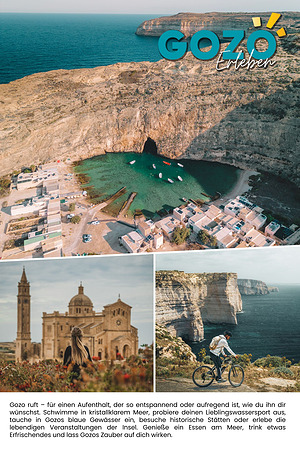Gozo ruft – für einen Aufenthalt, der so entspannend oder aufregend ist, wie du ihn dir wünschst. Schwimme in kristallklarem Meer, probiere deinen Lieblingswassersport aus, tauche in Gozos blaue Gewässer ein, besuche historische Stätten oder erlebe die lebendigen Veranstaltungen der Insel. Genieße ein Essen am Meer, trink etwas Erfrischendes und lass Gozos Zauber auf dich wirken.