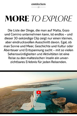 Die Liste der Dinge, die man auf Malta, Gozo und Comino unternehmen kann, ist endlos – und dieser 30-sekündige Clip zeigt nur einen kleinen, aber eindrucksvollen Ausschnitt davon. Egal, ob man Sonne und Meer, Geschichte und Kultur oder Abenteuer und Entspannung sucht – mit so vielen Sehenswürdigkeiten und Aktivitäten ist eine Reise zu den maltesischen Inseln ein unverzichtbares Erlebnis für jeden Reisenden.