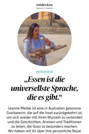 Leanne Meilak ist eine in Australien geborene Gozitanerin, die auf die Insel zurückgekehrt ist, um sich wieder mit ihren Wurzeln zu verbinden und die Geschichten, Aromen und Traditionen zu teilen, die Gozo so besonders machen. Wir haben mit ihr über ihre persönliche Reise und ihre Liebe zur Insel gesprochen.
