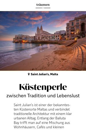 Saint Julian’ s ist einer der bekanntesten Küstenorte Maltas und verbindet traditionelle Architektur mit einem klar urbanen Alltag. Entlang der Balluta Bay trifft man auf eine Mischung aus Wohnhäusern, Cafés und kleinen Badebuchten, die den Ort sowohl für Einheimische als auch für Gäste attraktiv machen. Ein prägendes Wahrzeichen ist die Carmelite Church, die mit ihrer neugotischen Fassade und den hohen Türmen deutlich aus dem Häuserensemble herausragt. Sie gibt der Bucht ihr charakteristisches Profil und ist ein zuverlässiger Orientierungspunkt beim Spaziergang entlang der Promenade. Insgesamt zeigt sich Saint Julian’ s als moderner, zugänglicher Ort am Wasser, der sich trotz seines Wachstums den Bezug zur Küste und zum alltäglichen maltesischen Leben bewahrt hat. Besonders in den frühen Abendstunden, wenn der Himmel in warmes Licht taucht, entfaltet der Ort seinen ganz eigenen Zauber und zeigt, warum er zu den beliebtesten Küstenorten Maltas zählt.